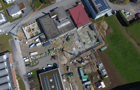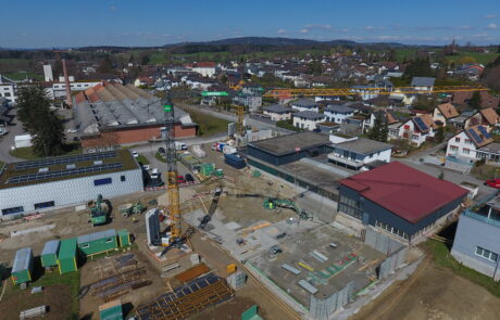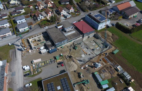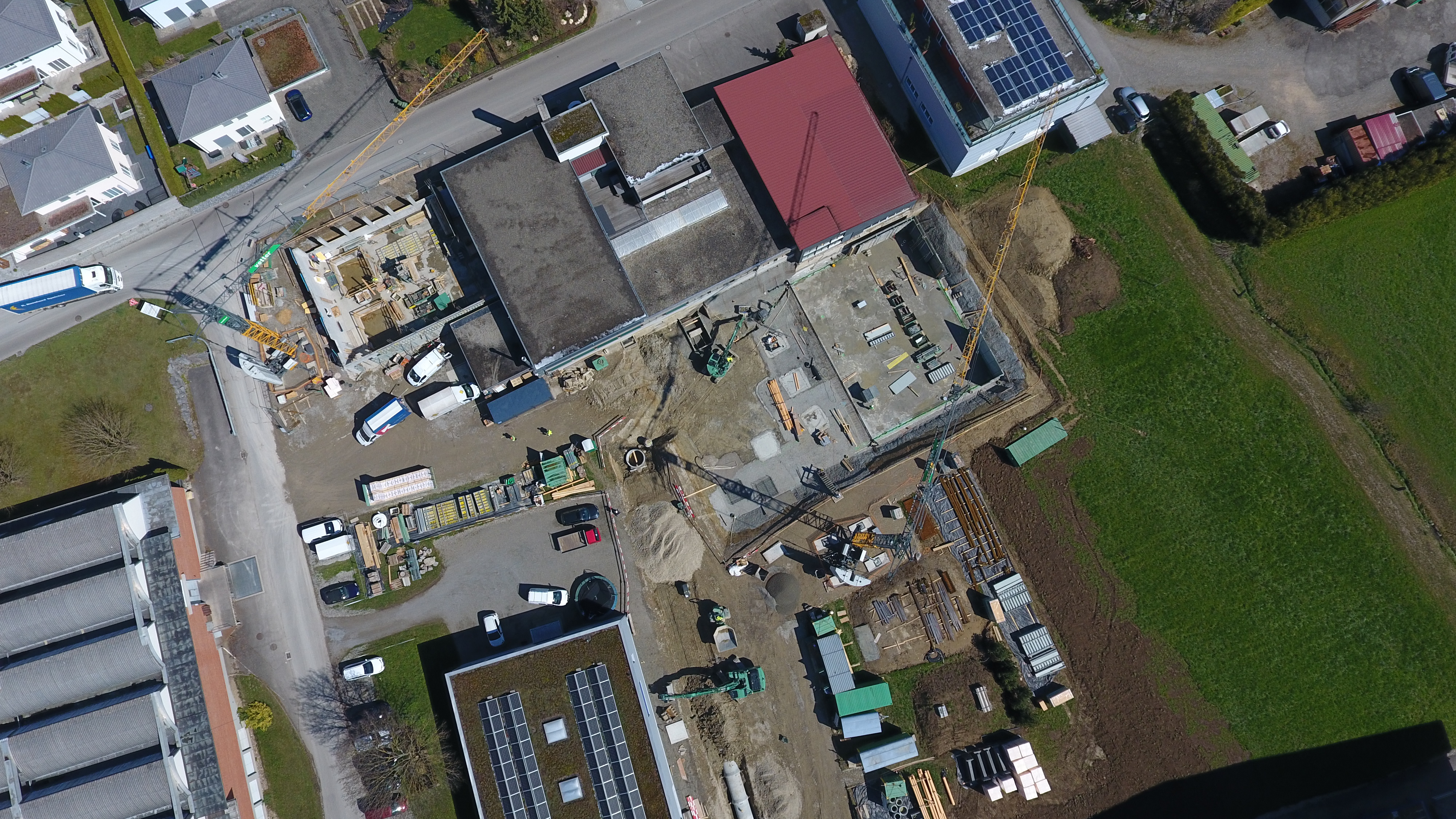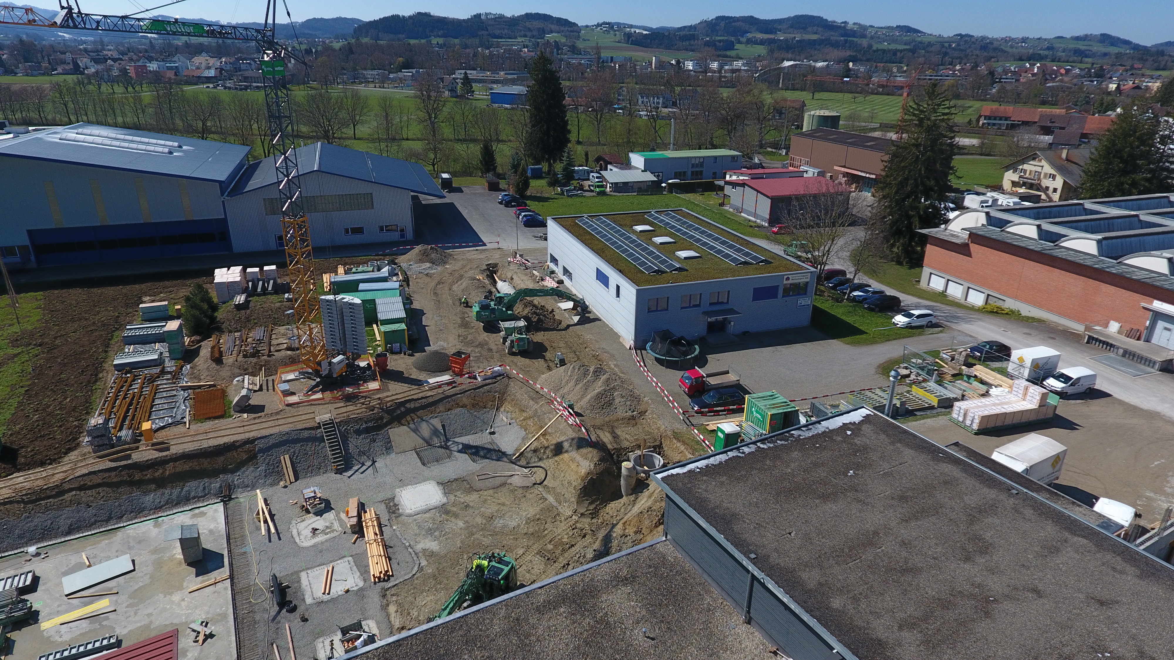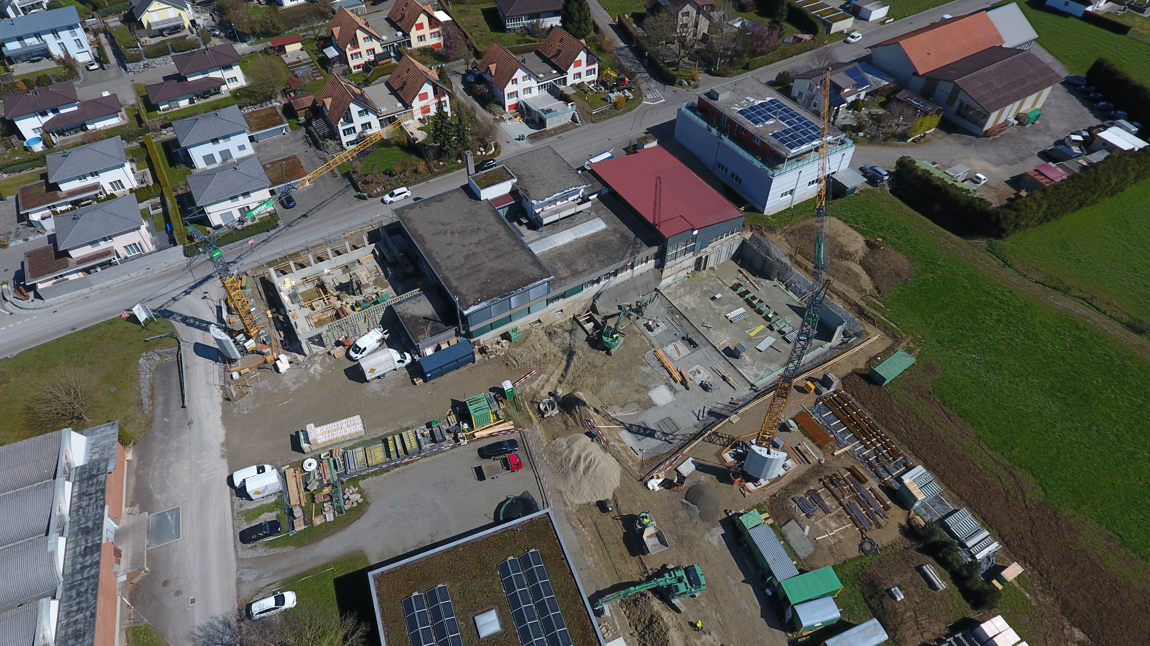 Die Betonarbeiten der Wände, Böden und Decken sind im vollen Gange. Danach wird der Holzbau aufgerichtet.