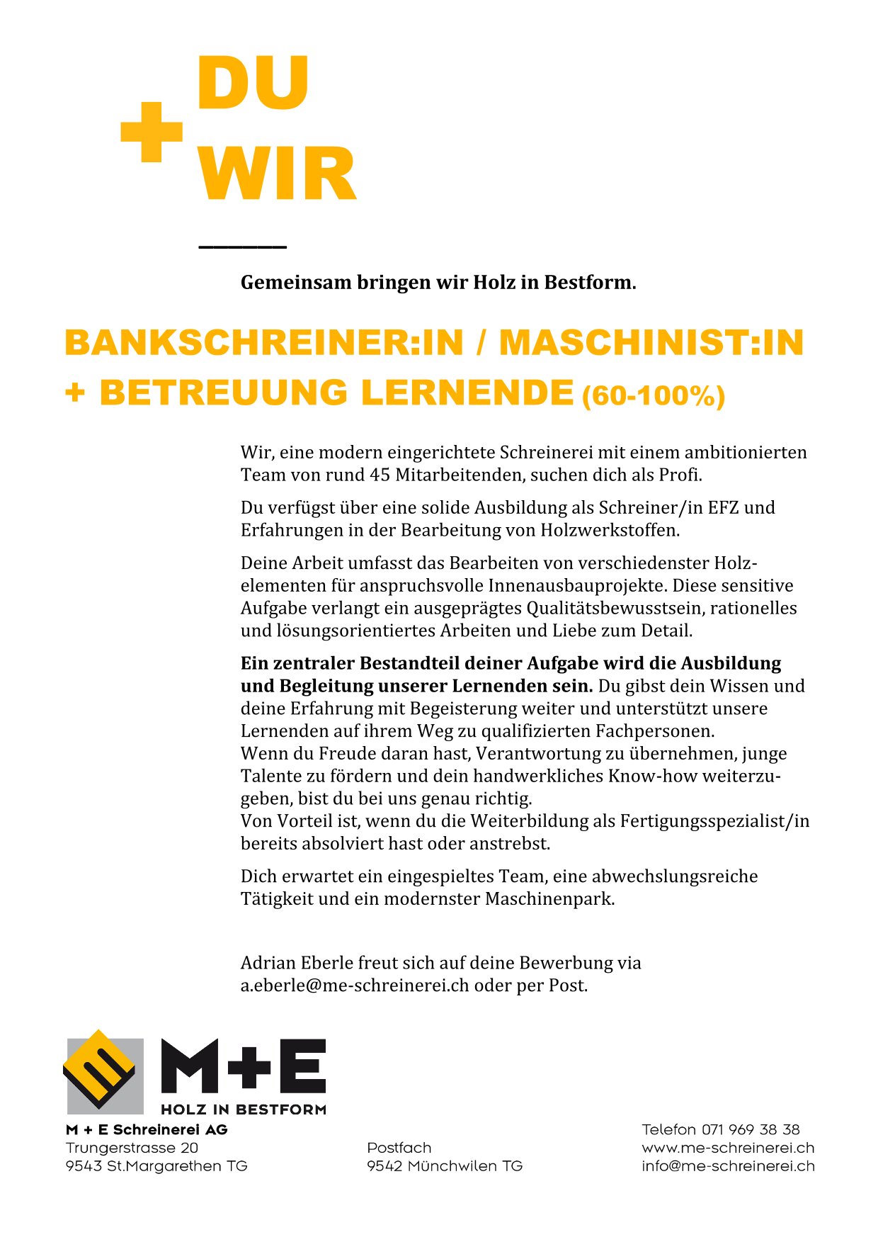 Bist du bereit, eine vielseitige Arbeitsstelle bei einem modernen Traditionsunternehmen anzutreten? Dann freuen wir uns auf deine Bewerbungsunterlagen! Du kannst uns deine Unterlagen entweder per Mail an Adrian Eberle (a.eberle@me-schreinerei.ch) oder per Post zukommen lassen.