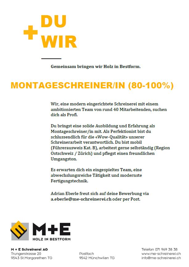 Bist du bereit, eine vielseitige Arbeitsstelle bei einem modernen Traditionsunternehmen anzutreten? Dann freuen wir uns auf deine Bewerbungsunterlagen! Du kannst uns deine Unterlagen entweder per Mail an Adrian Eberle (a.eberle@me-schreinerei.ch) oder per Post zukommen lassen.