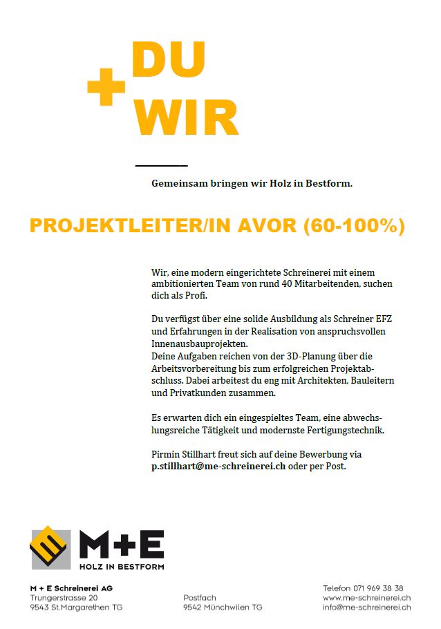 Bist du bereit, eine vielseitige Arbeitsstelle bei einem modernen Traditionsunternehmen anzutreten? Dann freuen wir uns auf deine Bewerbungsunterlagen! Du kannst uns deine Unterlagen entweder per Mail an Pirmin Stillhart (p.stillhart@me-schreinerei.ch) oder per Post zukommen lassen.